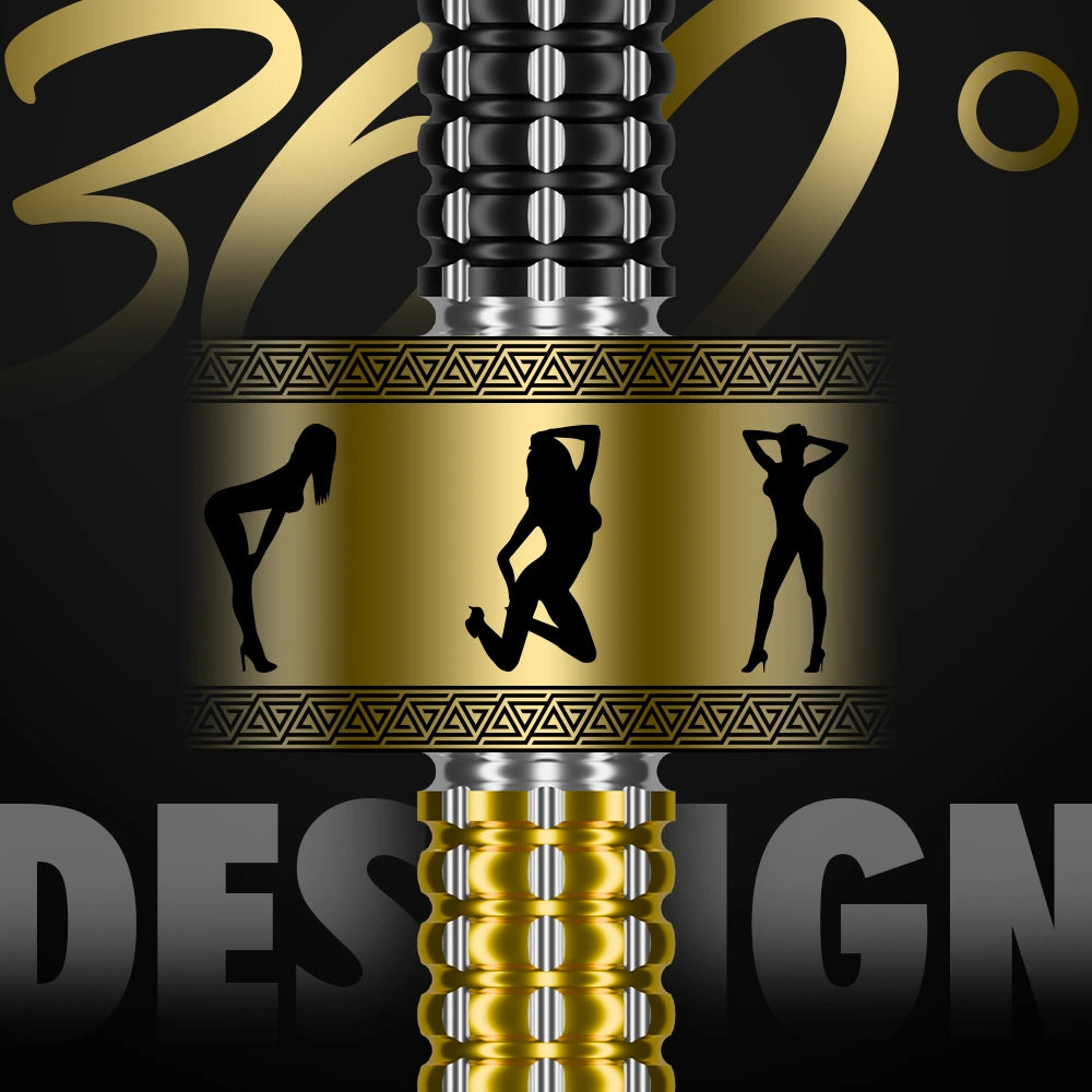 Das Herzstück der V1 ist der beeindruckende 360°-Mittelteil. Mittels hochpräziser Lasergravur haben wir Marisa in drei sexy Silhouetten auf dem Barrel verewigt. Eingerahmt von einem filigranen geometrischen Muster auf goldenem Grund sorgt dieses Design dafür, dass deine Darts aus jedem Winkel perfekt aussehen – egal wie du sie hältst.